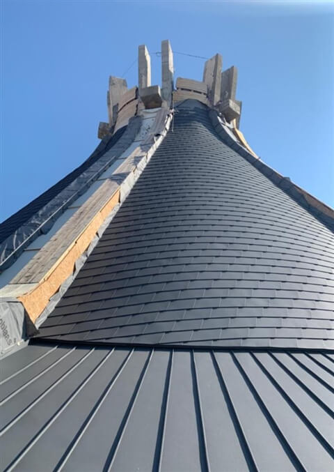 Per le aree a pendenza ridotta, l’impresa Lattoneria Lazazzera S.r.l. ha integrato il sistema con lastre Falzonal, anch’esse aggraffate, mantenendo coerenza visiva e prestazionale. Il risultato è un involucro continuo, tecnico e raffinato, in grado di restituire alla chiesa la sua identità architettonica originaria, ma con una nuova qualità energetica e formale.
