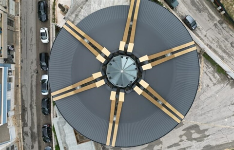 La selezione dei materiali è stata determinante per la qualità finale dell’opera. In stretta collaborazione con Prefa Italia, la progettista ha scelto un sistema di scandole in alluminio per il rivestimento della copertura, in colore grigio antracite, abbinato a lastre MayaGold per i costoloni estradossati. La doppia aggraffatura ha garantito una perfetta adattabilità alla superficie conoidale, evitando ponti termici e assicurando durabilità.